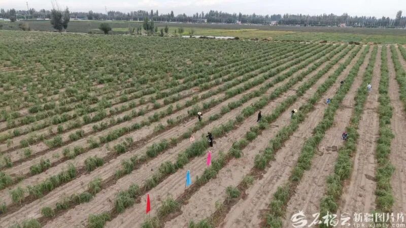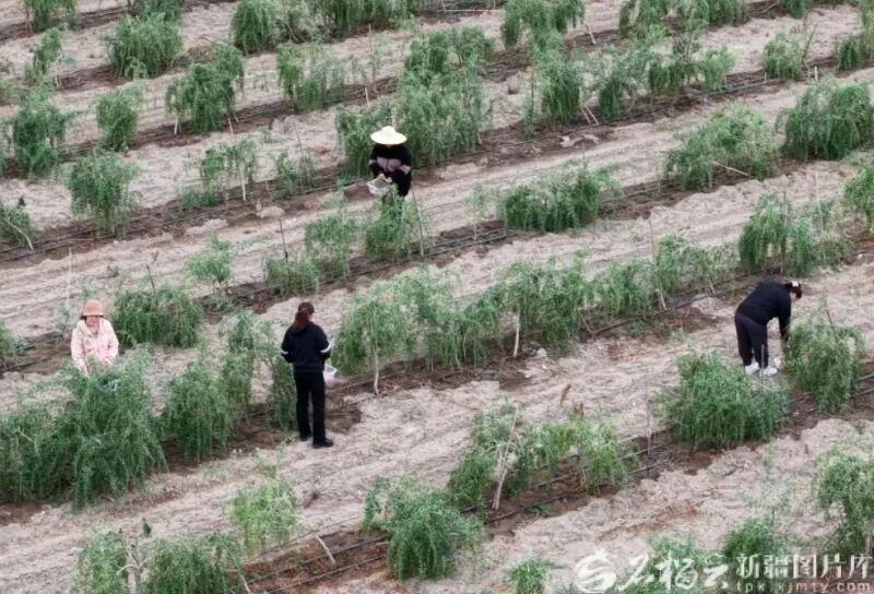 精河县托里镇吾夏克巴依西村种植户采摘枸杞鲜果。(9月11日无人机摄)