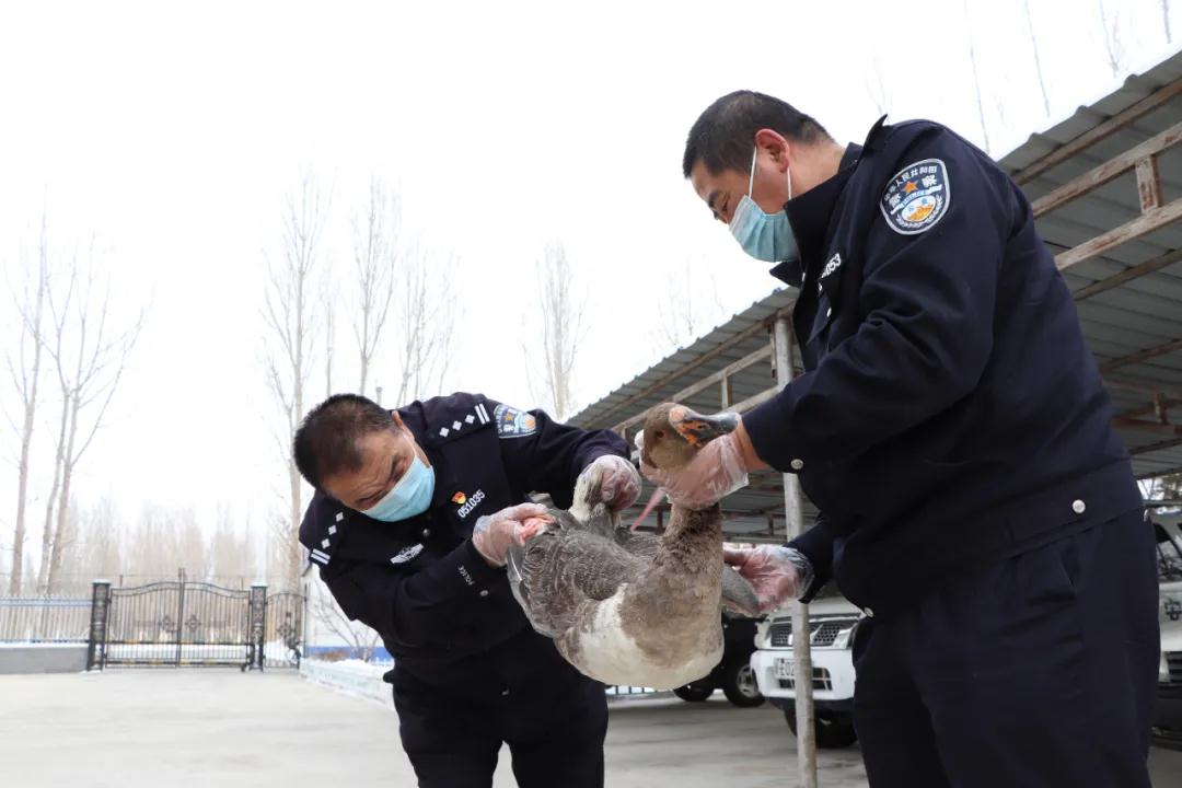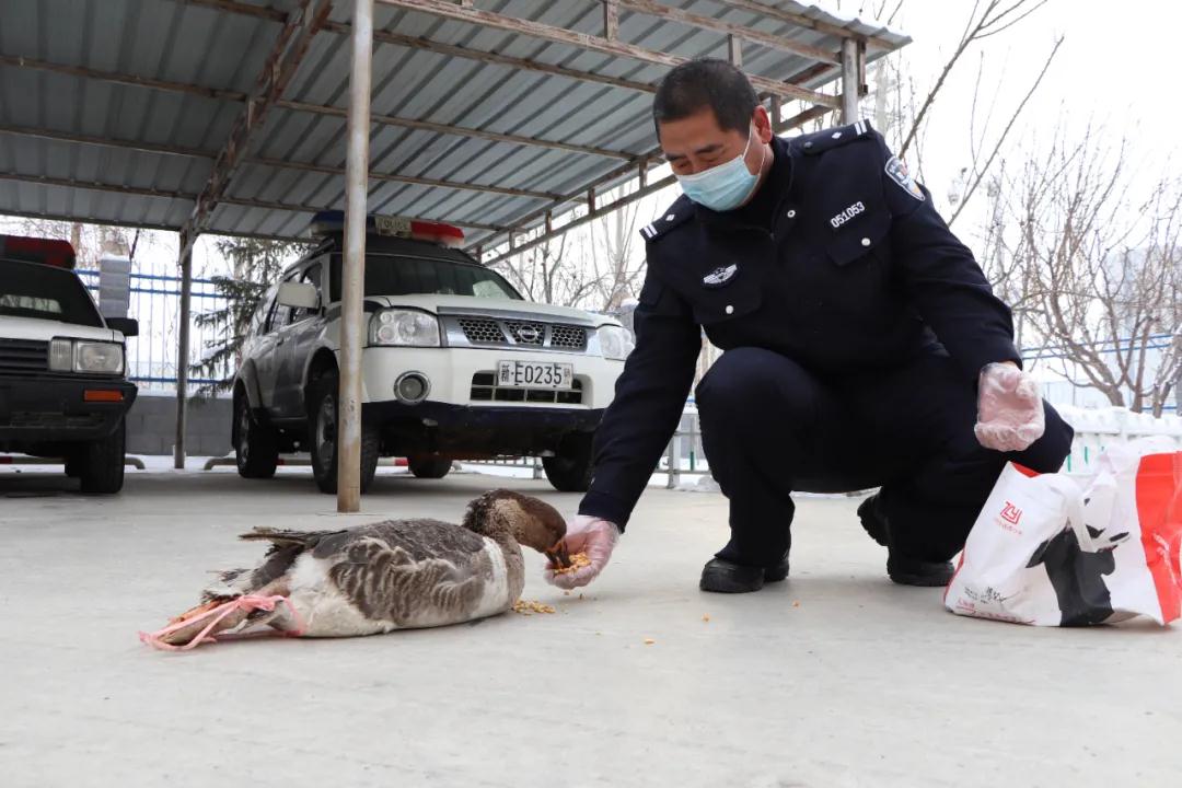 博州公安局森林分局精河森林派出所民警张天辰介绍说:“接警后,我们迅速到达现场。经确认,这是一只国家二级重点保护野生动物鸿雁。在仔细检查后,发现没有伤痕。我们判断可能是因为长时间没有进食,体力不支,导致无法飞行,便带回派出所投喂水和食物。”