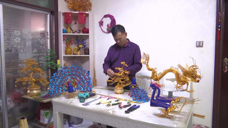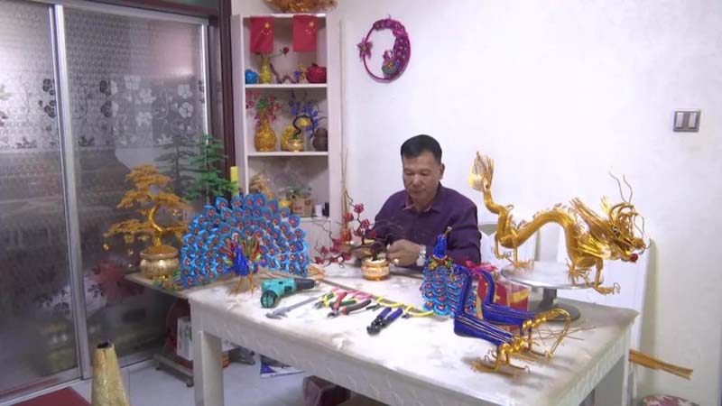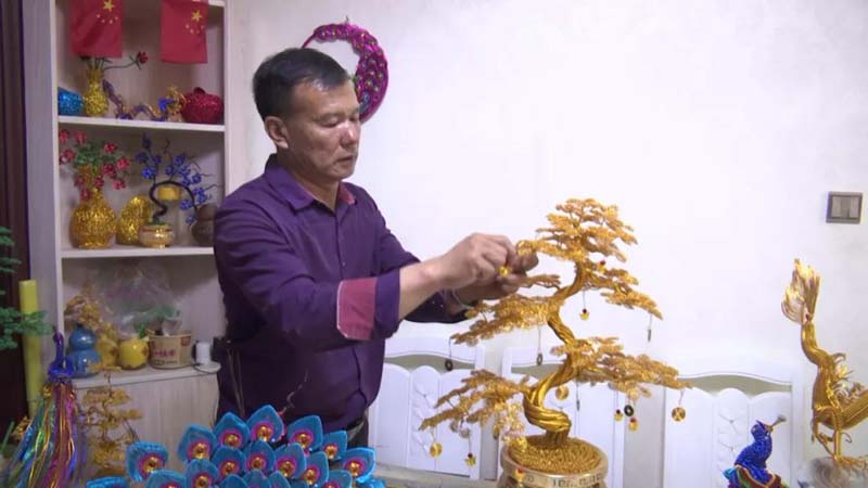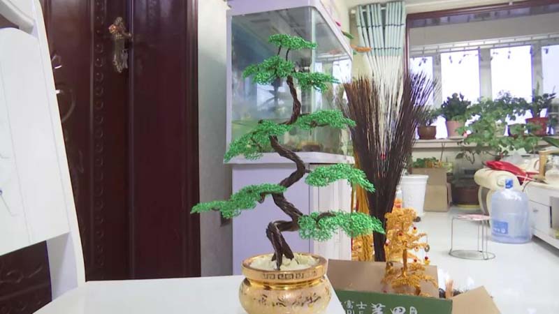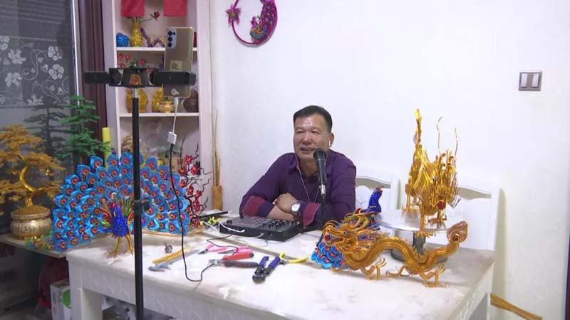 杨存旺说:“现在伊犁、博乐的花卉市场都有我的手工艺品。”一年多的时间,杨存旺用氧化铝丝共创作龙、凤凰、发财树、孔雀等手工艺品400余件,创收达4万余元。俗话说:“吃水不忘挖井人”,杨存旺的手工艺品越做越好,现在他也在抖音上开启直播授课,成了小有名气的“网红”。