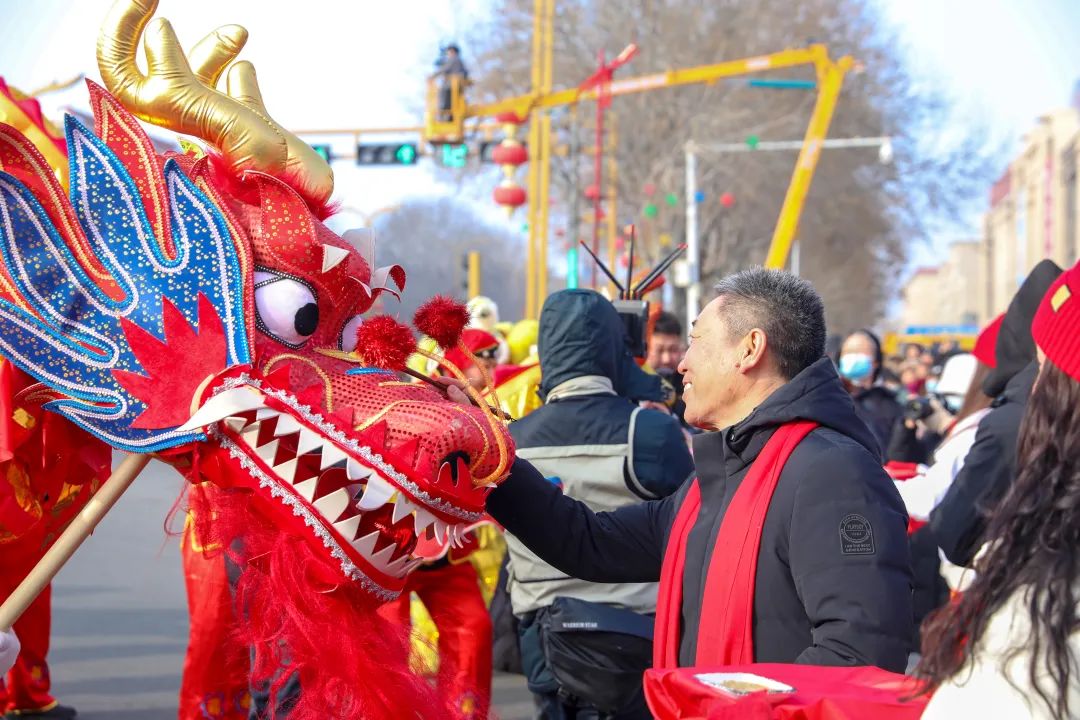上午12时,精河县人大常委会党组副书记、主任巴生加甫,县政协党组副书记、主席木哈代斯·阿不力孜为第一支社火队伍的祥龙点睛。县委常委、宣传部部长赵萍,县人民政府党组成员、副县长吴开华为瑞狮封利。