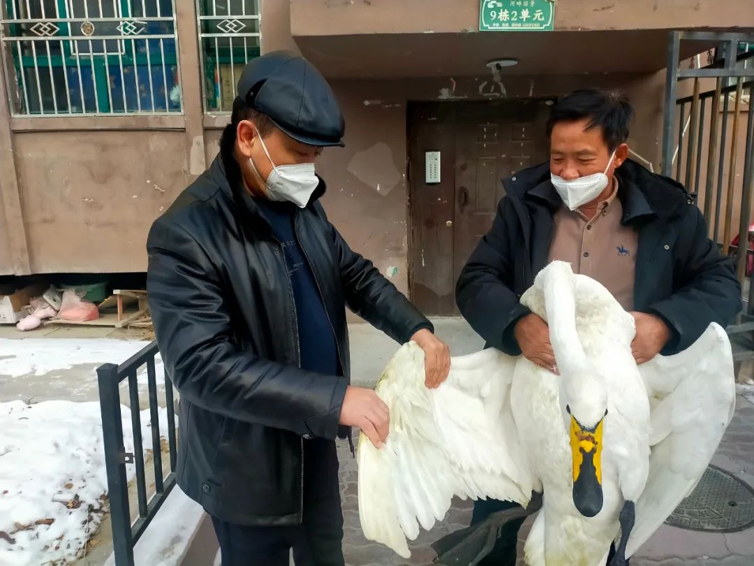 努尔巴哈提、买旦力等工作人员迅速赶到现场,经外观和体型比对辨认,鉴定此鸟为国家二级保护动物白天鹅。“我当时是在八家户农场农五队田间发现的这只天鹅,它因右翅膀受伤无法飞行,天气寒冷,我就把它先带回家,然后求助了县林业和草原保护服务中心。”郭永祥回忆说。
