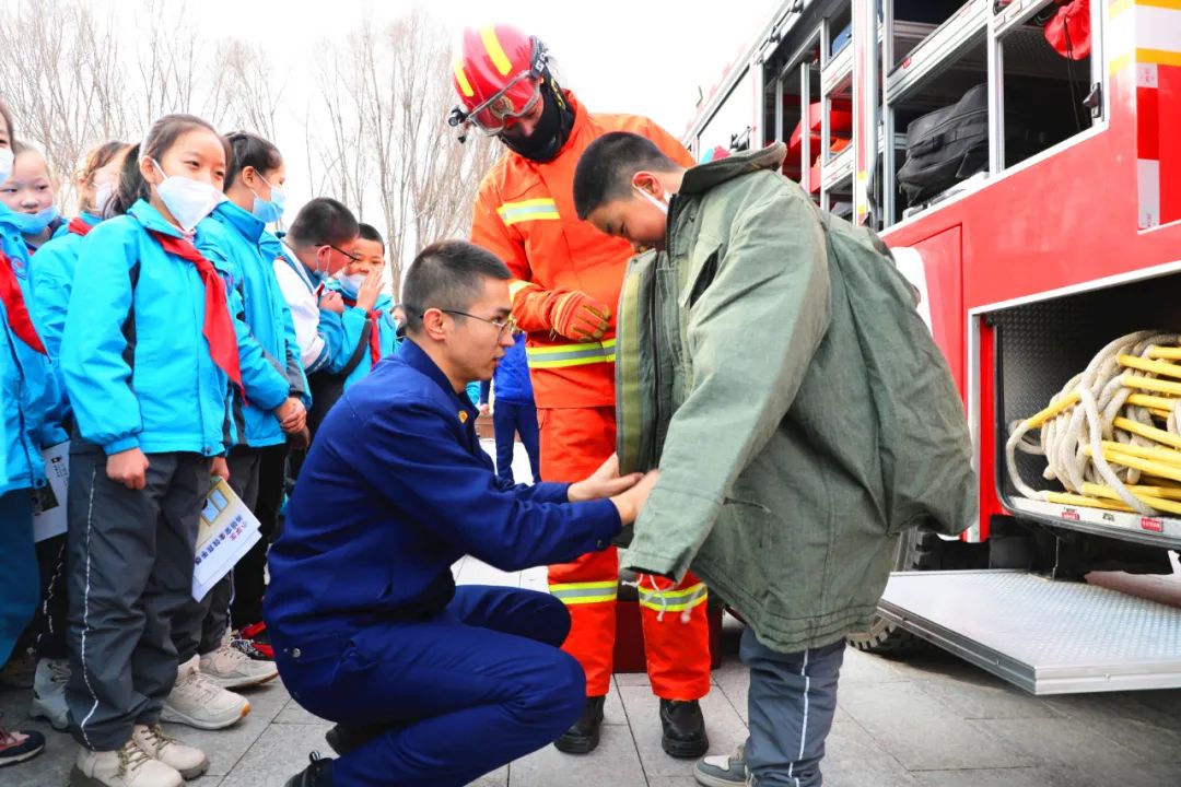 随后,消防宣传员把课堂“搬到”室外,带领学生们参观消防车、讲解装备器材使用方法。面对高大的消防车、新奇的救援装备,学生们充满了好奇,忍不住碰一碰,摸一摸,还有同学在消防员的帮助下亲自试穿了避火服,穿上厚重、闷热的衣服后,更加深刻地感受到消防救援人员的艰辛。