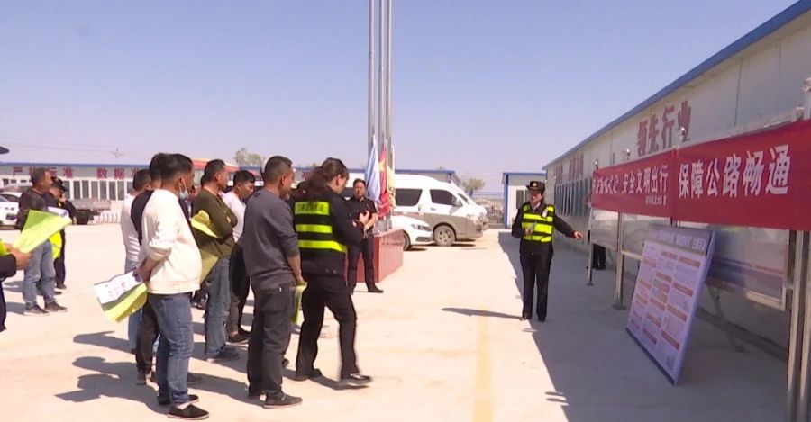 在精河县中铁二十一局二线项目部,路政宣传队伍采取悬挂标语横幅、摆放宣传展板、发放宣传彩页、观看视频等方式,深入宣传公路路政抓防控、保畅通、守安全、惠民生等举措。