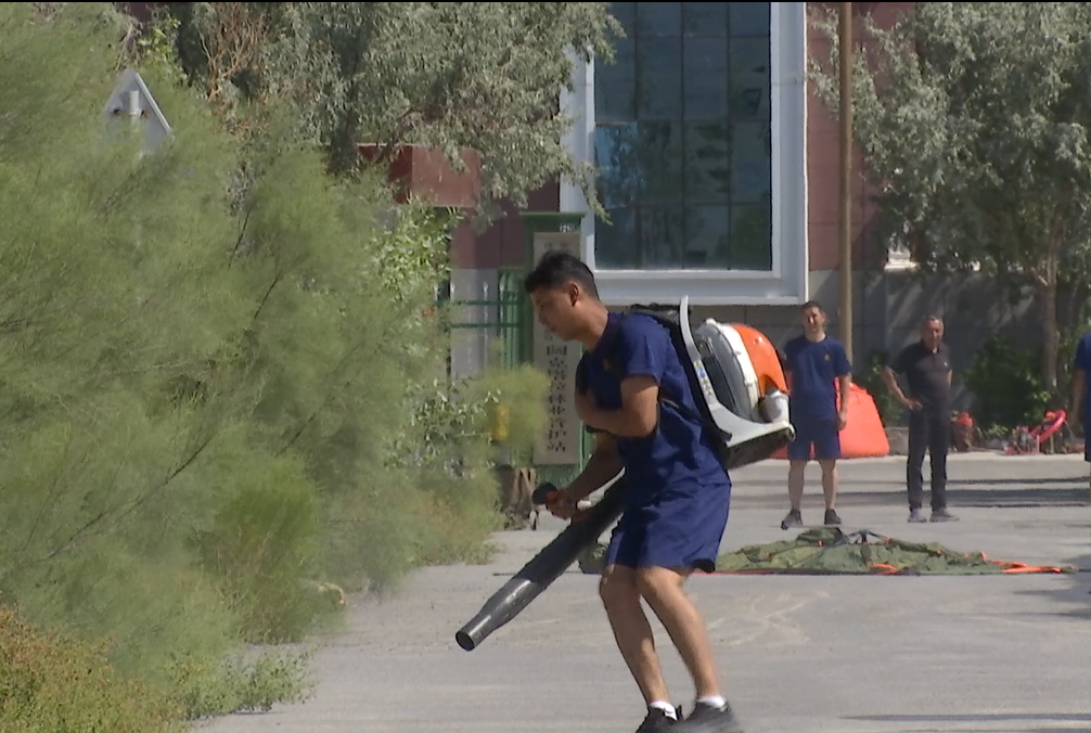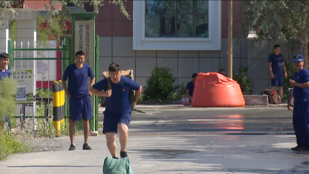 在阔克塔拉林业管护站内,通过选拔的队员正在抓紧训练。随着教官下达“开始”口令,他们快速冲向背负式风机和切割机等机具,练习灭火机具的操作与使用,还有部分人员在进行单双杠、木桩扛举等体能训练。