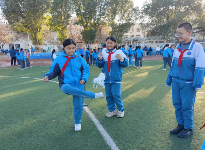 11月14日,记者走进精河县第二中学,随着大课间铃声一响,孩子们犹如离弦地箭一般冲出教室,尽情享受大课间带来的乐趣。在体育老师的带领下,同学们充分释放学习压力,在欢声笑语中参与花样跳绳活动。课间十分钟,有的孩子们一起跳房子、玩沙包、踢毽子、跳皮筋、打排球,感受传统游戏带来的新鲜与快乐,还有的孩子们在班里和下象棋、五子棋、跳棋,感受棋类乐趣。