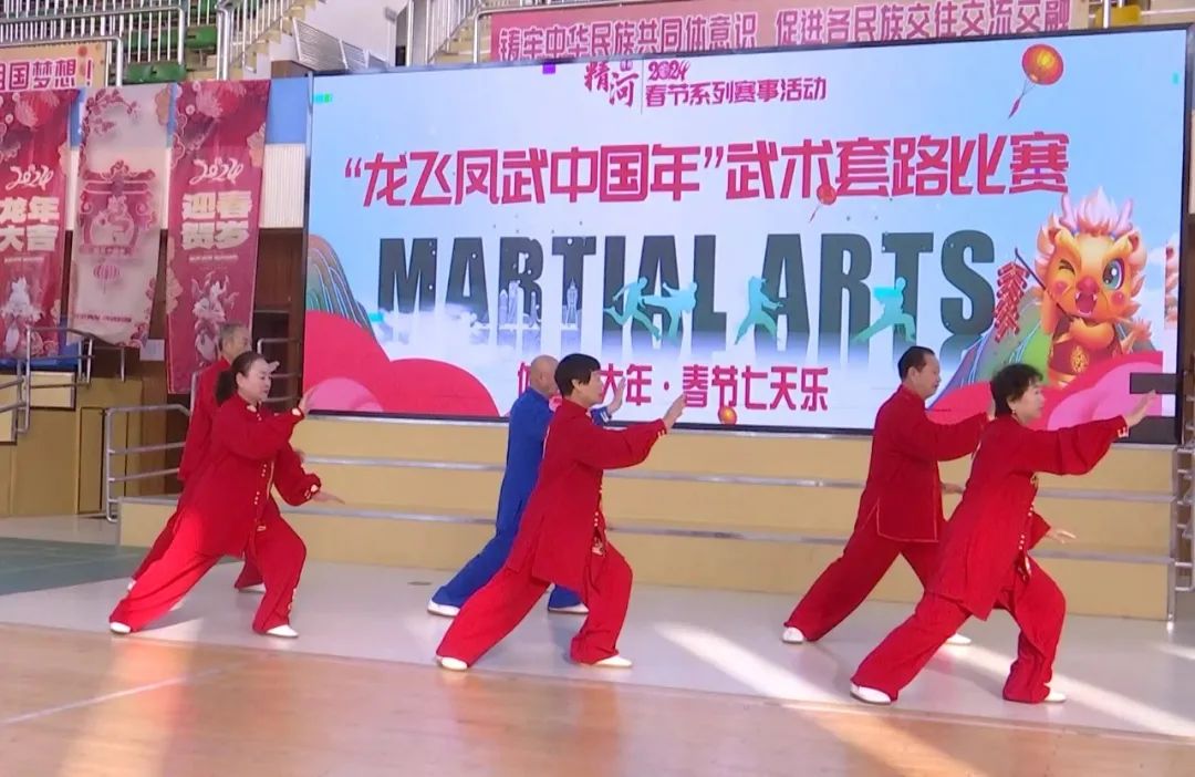 近日,精河县“龙飞凤武中国年”武术套路比赛在县体育馆举行,吸引了全县18名武术爱好者参赛。