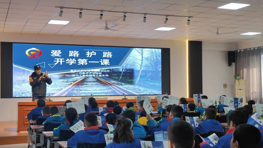 新学期伊始,3月1日,乌鲁木齐铁路公安局奎屯公安处精河南站派出所联合精河县委政法委、乌鲁木齐电务段精河车间、奎屯工务段精河线路车间以开学为契机,深入精河县第二小学开展形式多样的爱路护路宣传,为学生们精心安排精彩纷呈的“开学第一课”。