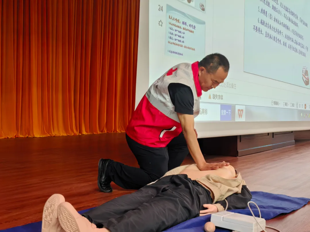 培训中,红十字会工作人员向学员讲解了心肺复苏技能、创伤救护基本技能(止血、包扎、固定、搬运)、常见急症现场处理、现场避险逃生知识、突发事件和意外伤害现场应对等。