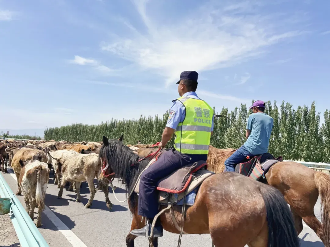 “马背上的巡逻队” 提前深入牧民定居点,详细了解牧民转场时间与路线,对转场沿途路段进行勘查、标注,提醒牧民做好安全防护。同时,民警还携带拉绳、食物等应急物品,在做好后勤保障的同时全程跟进,随时为转场牧民及牲畜提供应急保障服务。