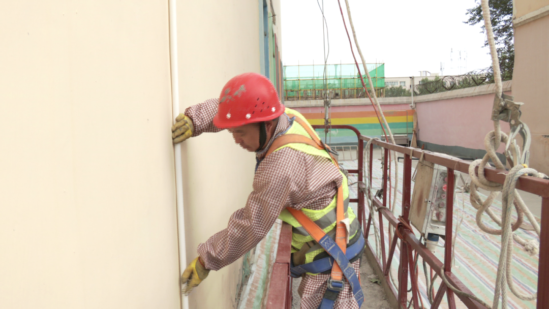 与此同时,在精河县幸福幼儿园,工人手持专业工具,有条不紊地处理墙体,仔细铲除墙面表层的旧涂层,确保墙体基层平整干净;教学楼内,工人拿着抹子,将调配好的腻子均匀涂抹在墙面上,每一个动作都细致入微。