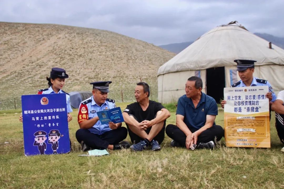 8月1日,精河县公安局大河沿子镇派出所“马背上的宣传队”深入牧区,开展防范电信网络诈骗宣传活动,将反诈知识送到群众家门口。