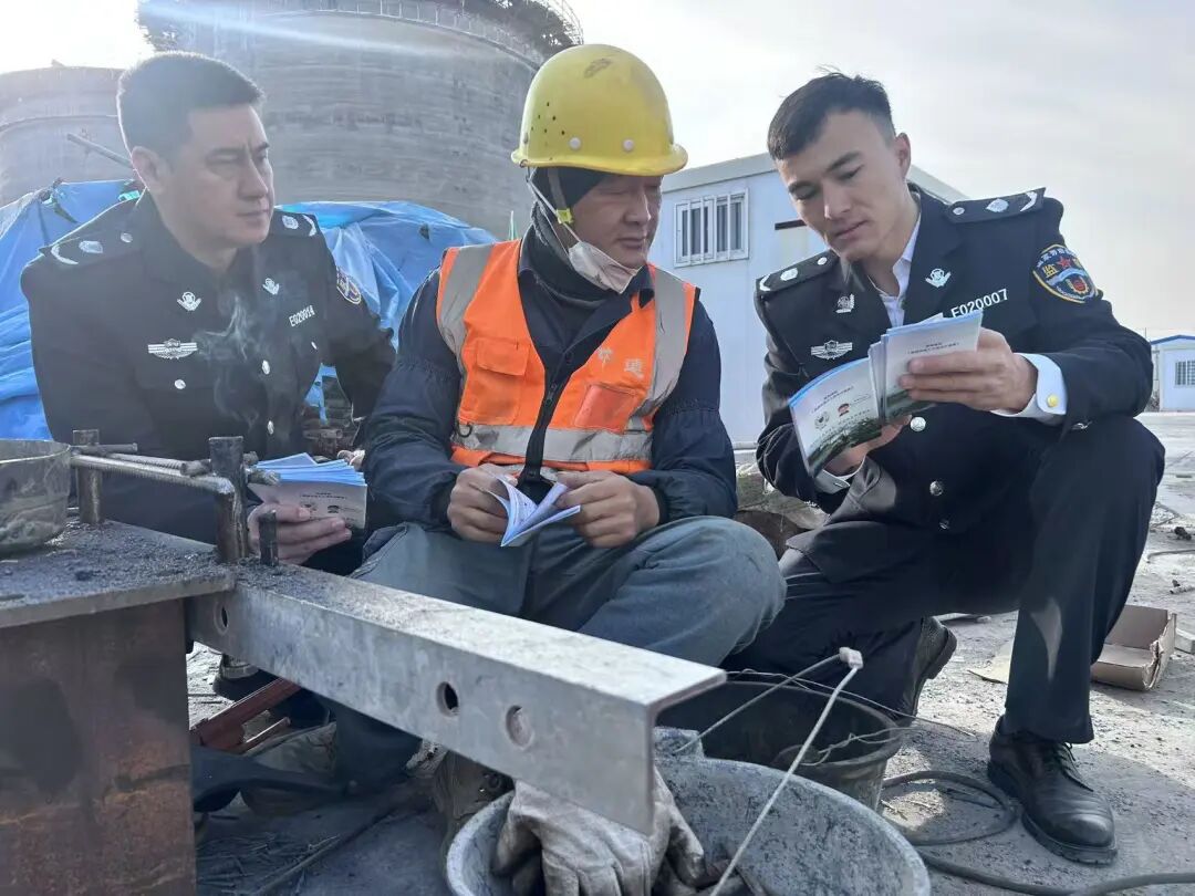 近日,精河县人社局劳动保障部门执法人员来到中央储备粮精河直属库有限公司仓储项目现场,向工人发放劳动保障“口袋书”,普及维权知识,并查看施工方与工人的合同签订情况,从源头规范用工流程。
