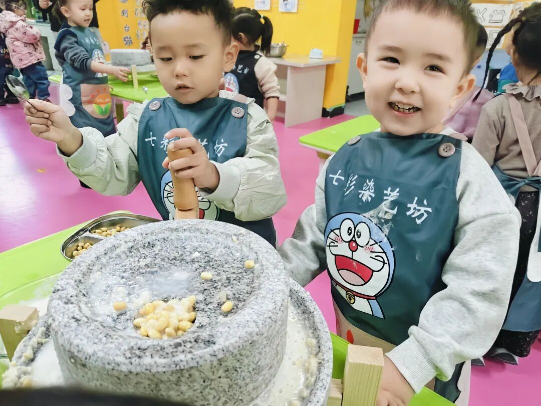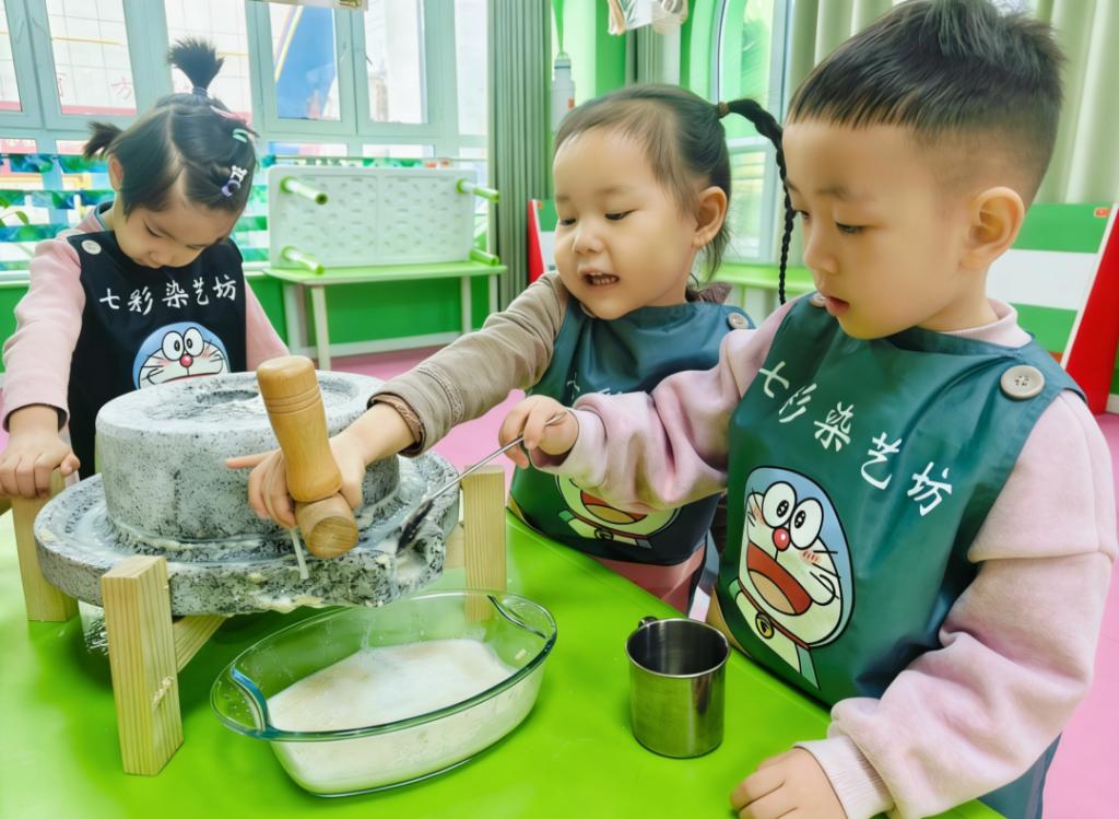 活动室里,小石磨刚一亮相,孩子们就围上前去,眼里闪着好奇的光。“我们要变魔术啦!”老师耐心讲解后,孩子们立刻化身“小磨坊主”,分组忙碌起来,你舀豆、我加水。“咕噜咕噜”,磨盘缓缓转动,乳白色的豆浆从磨缝中渗出,像小溪一样顺着石槽流淌。“出豆浆啦!真的变出来啦!”孩子们兴奋地拍手跳跃,豆香伴着欢笑声在空气中弥漫。