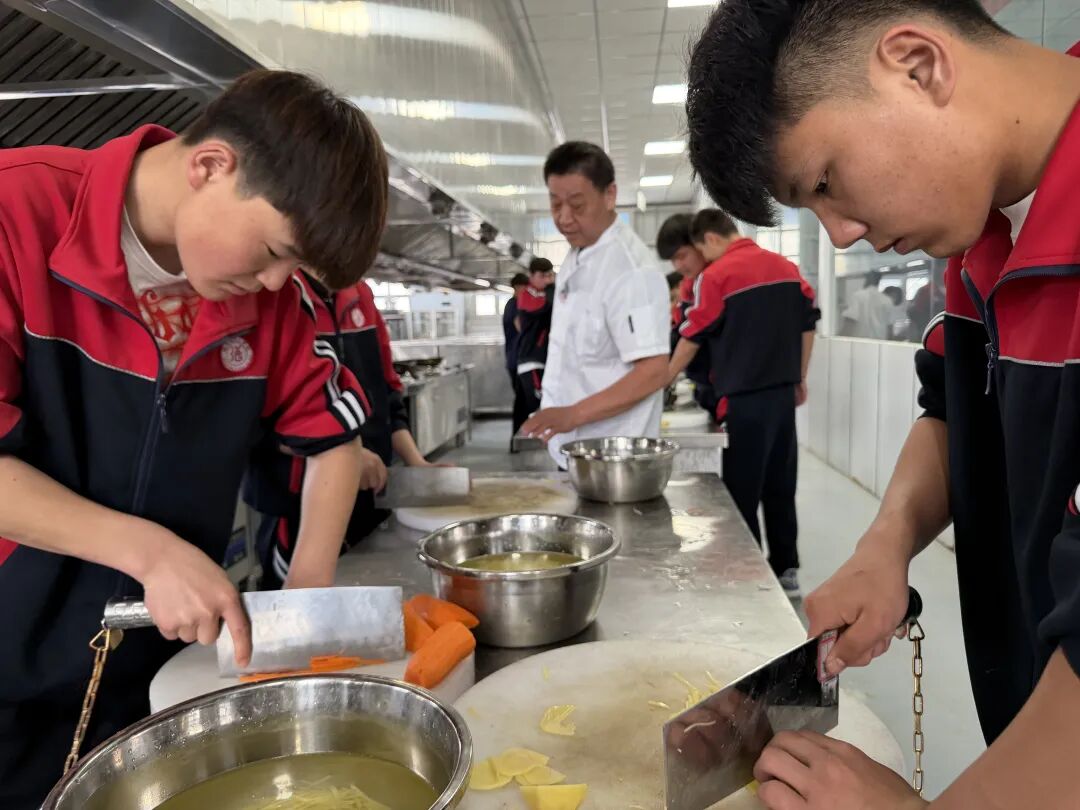 在烹饪实训教室,浓郁的香气瞬间包裹了整个空间。案板上,刀具起落之间,萝卜、土豆等食材瞬间被切成均匀的细丝;炉灶前,选手们手持炒勺,熟练地颠动着锅中的菜肴,动作行云流水。