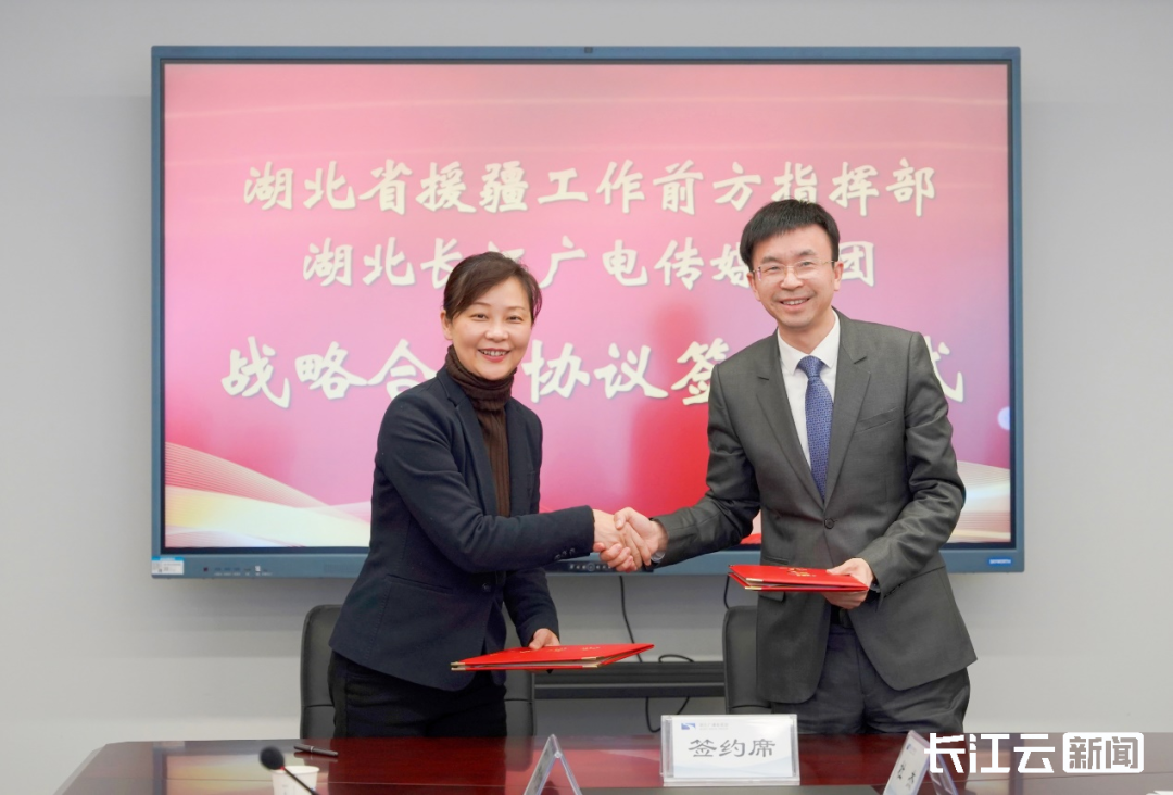 1月25日,湖北省援疆工作前方指挥部与湖北长江广电传媒集团战略合作协议签约仪式在湖北广电传媒大厦举行。湖北省援疆工作前方指挥部党组成员、副总指挥李建峰和湖北长江广电传媒集团党委委员、副总经理陈前代表双方签署战略合作协议。