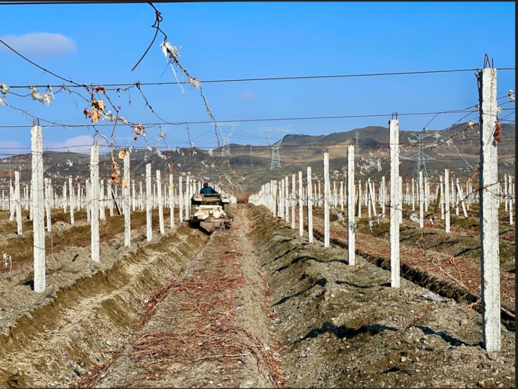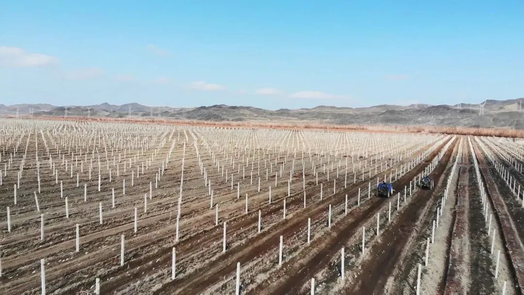 近日,在精河县茫丁乡北地东村守望农场千亩葡萄园种植基地,两台平地机正开足马力紧张作业,为葡萄出土上架做充足准备。