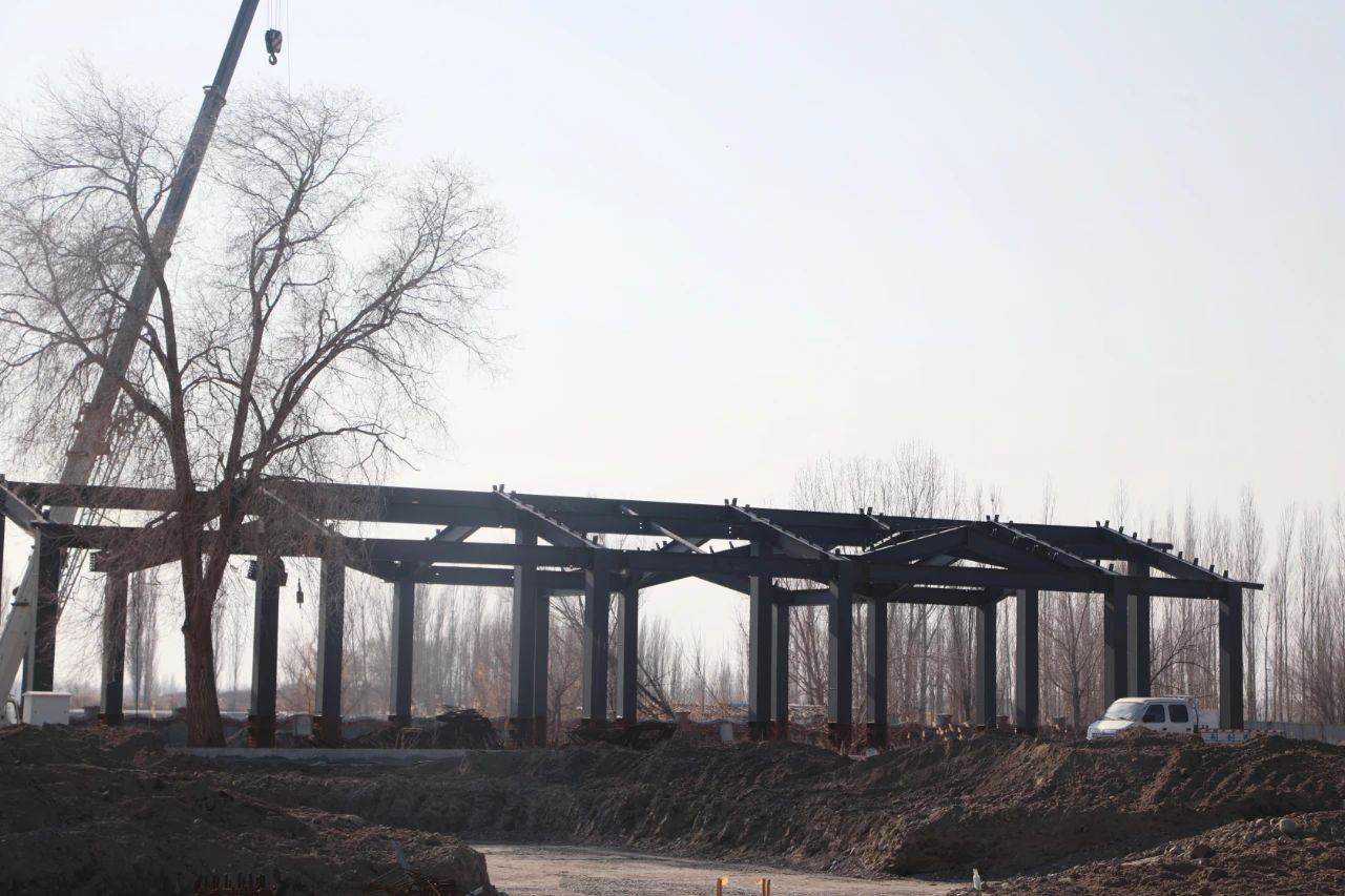 近日,记者在精河县茫丁乡五棵树村乡村振兴示范村建设项目现场看到,项目全貌已初具雏形,园区内书咖、湖畔民宿、农产品交易大厅、民居改造区等主要建筑主体结构已完成,拖拉机、吊车等机械正在作业,工人们三五成组,有序进行管网埋填、人行道路基铺装等工程。