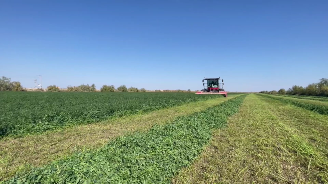 精河县天北牧业草料种植专业合作社总经理姚琨说:“目前是苜蓿收割的最佳时间,预计今年第一茬苜蓿亩产400公斤左右,我们有信心为企业提供优质饲草。”
