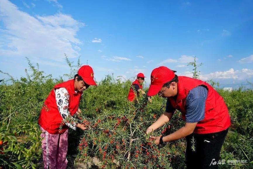 目前,全县枸杞种植面积达10万亩,年产干果1.5万吨,产值超6亿元,占全县农业总产值的35%、占农民纯收入21%博尔塔拉蒙古自治州精河县八家户农场,志愿者正帮农民采摘枸杞。(摄影:王群)“我们一直注重把素质好、能力强的农村党员培养为产业发展的‘主心骨’,齐心协力发展壮大枸杞产业。”精河县枸杞产业发展中心主任赵玉玲说。精河县采取党员干部划片包地任片区长的形式,种植户在种植、管理、销售环节遇到困难,只需向片区长“点单”,片区长统一向外联系和对接服务。目前,精河县82个县直部门的2486名党员干部包联了8075亩枸杞地,开展助农服务。精河县通过搭建科技人才服务乡村振兴平台,加强与科研机构、高校的深度合作,培养枸杞育种、种植、加工、流通等领域的专业人才。“我们通过扶持农民专业合作社,带领种植户进行标准化种植。目前,已扶持23家农民专业合作社,吸纳社员806人,带动农户2100户。”赵玉玲说。“有了技术员指导,有了合作社领路,加快了我们致富的步伐。”精河县托里镇吾夏克巴依西村村民龚恒宽说,“县里还联系企业帮我们销售,我家枸杞的种植面积从600多亩增加到了1000多亩,我对种植枸杞充满信心。”