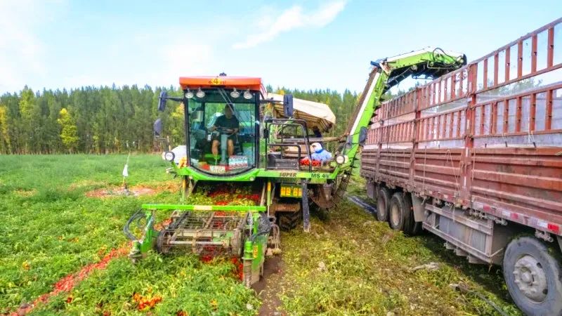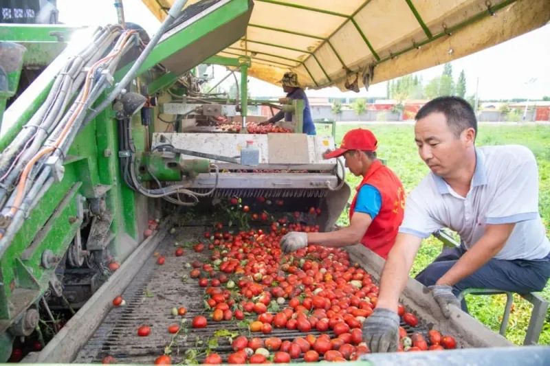 眼下,精河县阿合其农场4200亩加工番茄喜获丰收,连日来,农户们抢抓农时展开全面采收工作,全力保障今年番茄丰产增收。