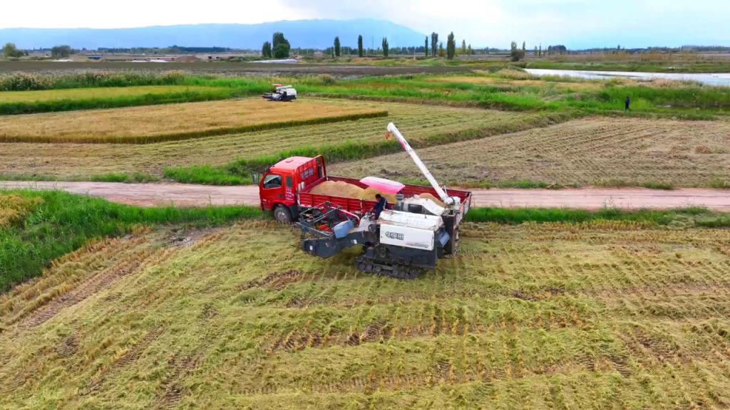 金黄遍野、稻米飘香。精河县大河沿子镇千亩水稻成熟,陆续进入收割期,当地群众抢抓晴好天气收割,田间地头一派繁忙的丰收景象。