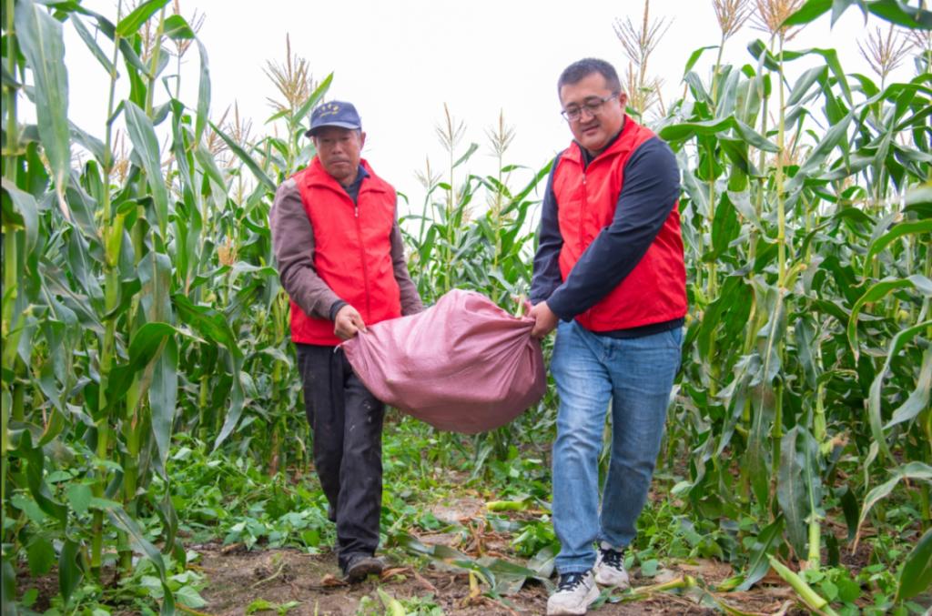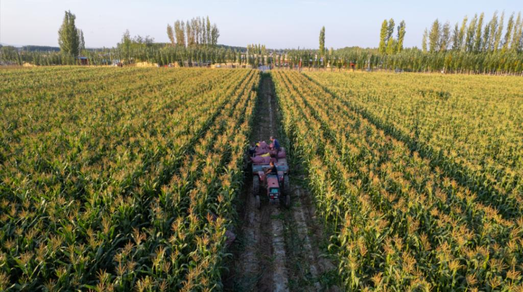眼下,阿合其农场的400亩水果玉米喜获丰收,村民们穿梭田间,采收玉米、装车一气呵成,一片忙碌的丰收景象。