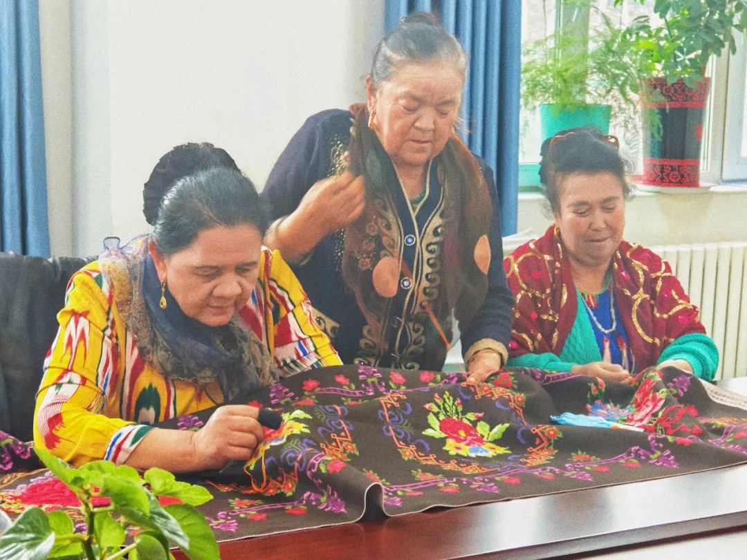 阿米汗·司马义的孙女齐曼古丽·吐尔洪说:“奶奶听闻村上有妇女想学刺绣,非常高兴,立马答应授课。大家都可以通过学习刺绣增长技能,用自己的双手改变生活。”