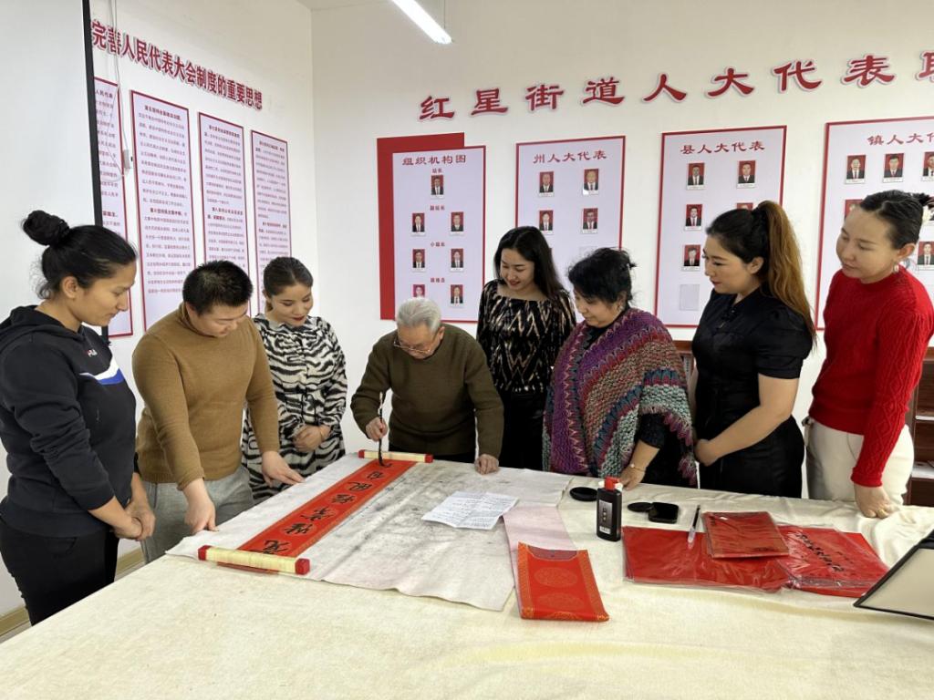 “党性常锤风自正,民情慎察国长兴”。看到这副廉政春联,居民张国庆爱不释手,他说:“老师的字写得刚劲有力,内容也给我很大的启示。马上就要过春节了,我一定会把‘廉洁自律’牢记心间。”红红的春联、浓浓的墨香、带“廉”味的文字,现场处处是喜庆祥和的节日气氛。活动结束后,工作人员将清廉文化元素融入其中的春联赠送给社区党员干部及各族群众,让广大干部群众在欢度新春佳节的同时,接受廉政文化的熏陶,增强廉洁自律意识,形成风清气正的社会风尚。东城社区夕阳红舞蹈队成员杨凤琴感叹道:“风清气正的廉政环境,需要大家共同努力,社区将新年‘廉礼’送到了居民家,非常暖心。”