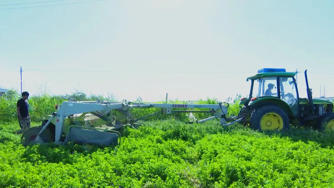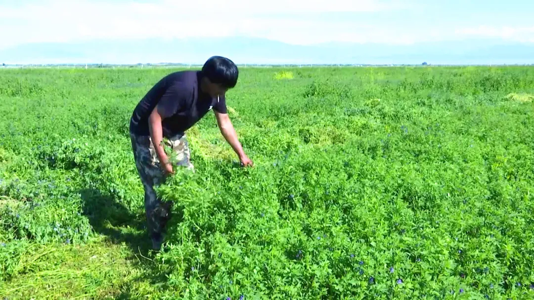在托里镇基布克村种植户王政华的苜蓿地里,大片苜蓿绿地流青溢翠、清香扑鼻,长势喜人,大型收割机往来穿梭其中,有条不紊地作业。王政华说:“今年种植了100亩苜蓿,现在都是机械化收割,预计5天左右就可以收割完。”