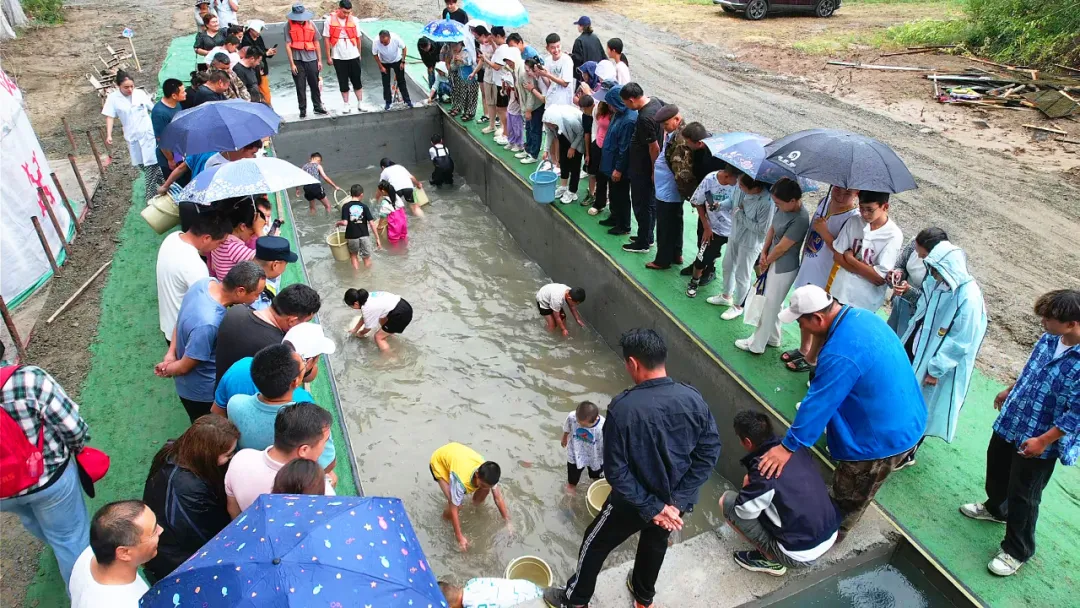 在摸鱼活动区,选手们卷起裤腿,挽起袖子,伴随着主持人一声令下,纷纷涌入水池之中,竞相摸鱼,激烈角逐。孩子们肆意奔跑在泥塘,体验开盲盒般的快乐,一片沸腾,欢呼声、呐喊声、尖叫声此起彼伏,谱写出了一曲乡野交响曲。
