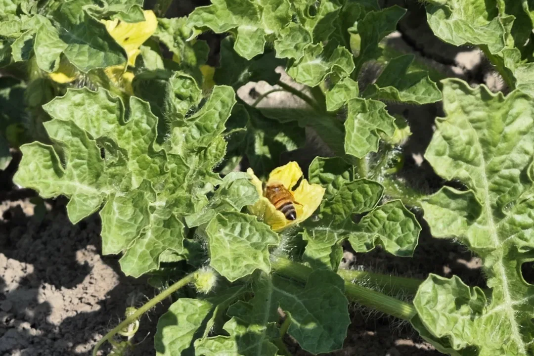 近日,走进精河县阿合其农场农二队的二茬西瓜地里,成群的蜜蜂们正在瓜秧中来回穿梭,不时落在黄色的西瓜花蕊上授粉、采蜜,绿油油的西瓜秧生机勃勃,黄色花蕊含苞待放,零星幼小的瓜果长势喜人,一片欣欣向荣好景色。