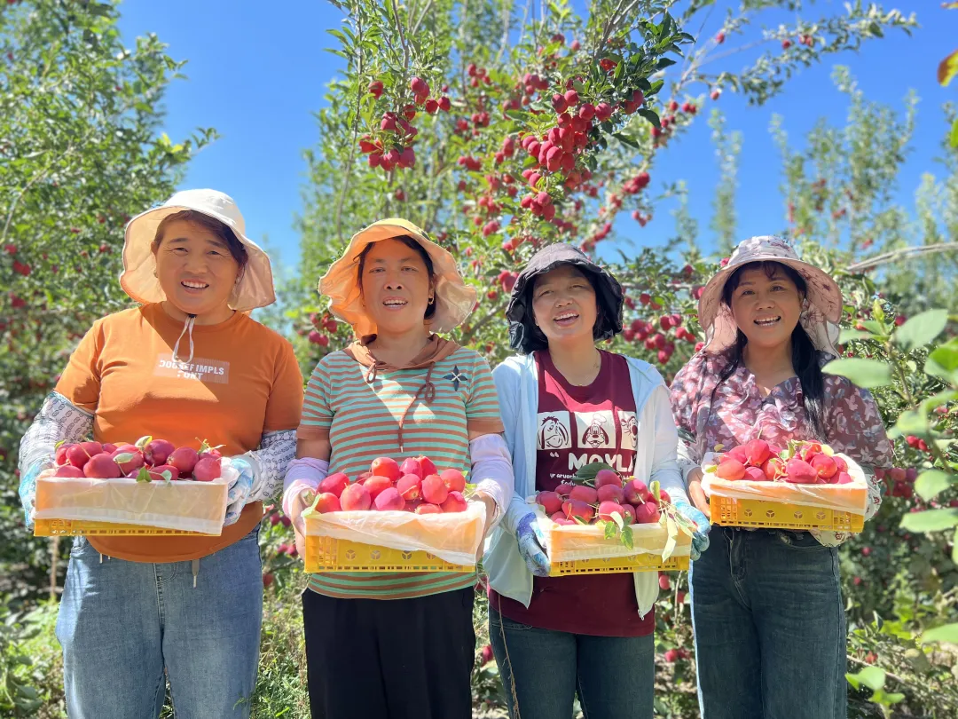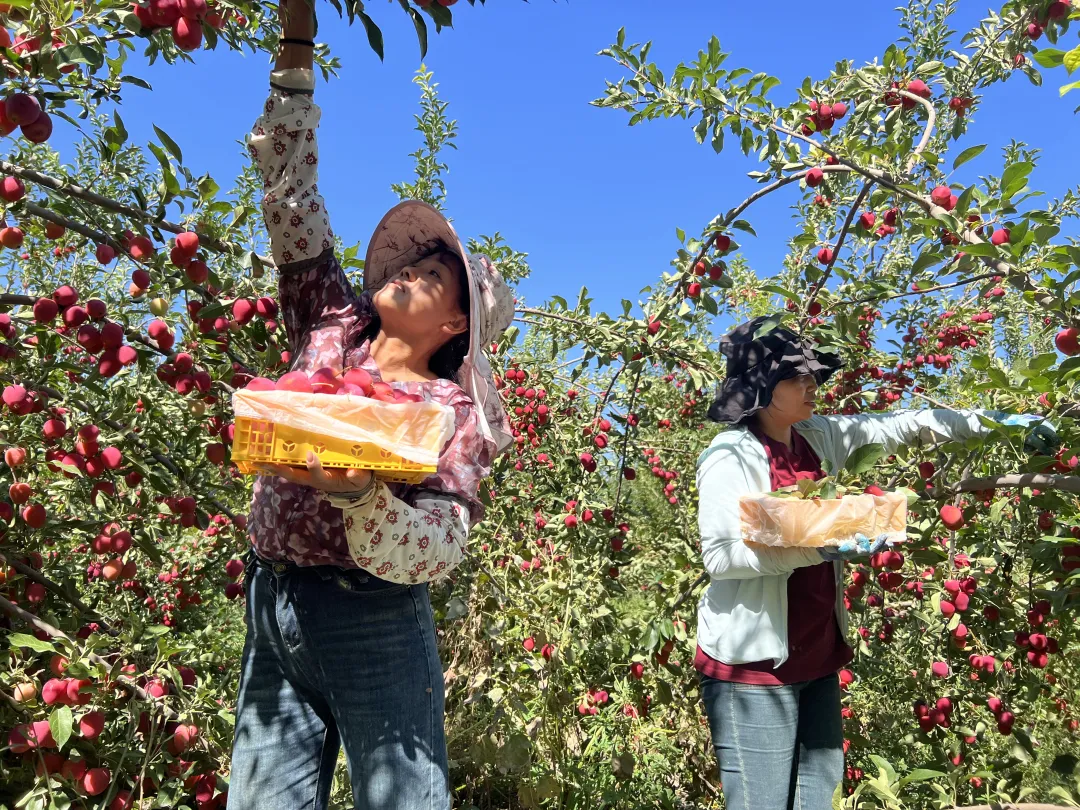 托里镇浩图那莫墩村的海棠果园也同样热闹。红彤彤的海棠果高挂枝头,穿梭在果园中的游客脸上满是欢喜。“果园的香妃海棠特别甜,我带着家人来体验采摘乐趣。”游客李乐说。海棠果成熟后,各大客商纷纷前来收购,果园里一半游客,一半采摘工人,处处洋溢着丰收的喜悦。正逢果实成熟季节,每天都会有30多名来自附近村队的采摘工人忙碌地穿梭在果树之间,既解决了季节性用工难的问题,又让大伙实现了在家门增收。