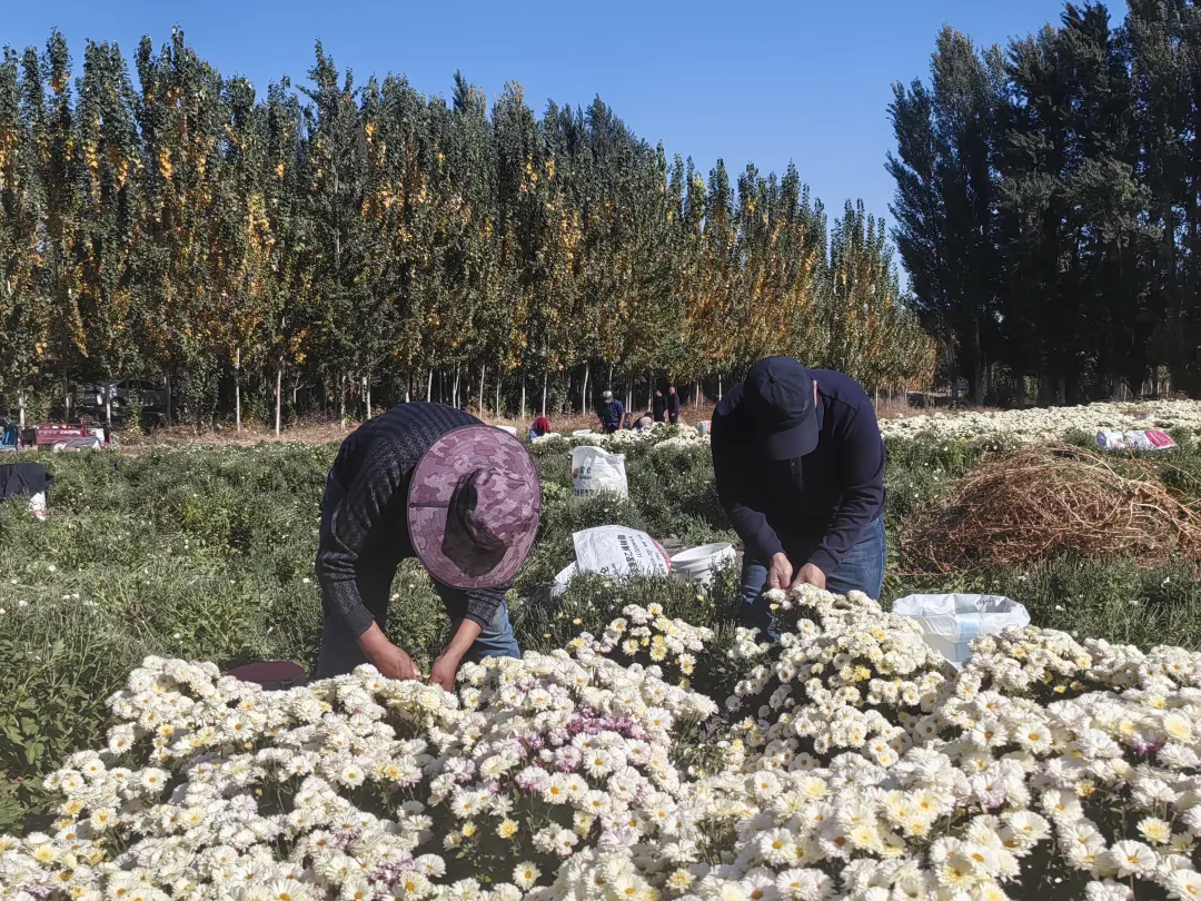 秋意渐浓,精河县茫丁乡五棵树村的百亩菊花基地进入盛花期,迎来丰收季。近日,记者来到这片种植着药用菊花和观赏菊花的基地,感受丰收的喜悦和秋日的美景。