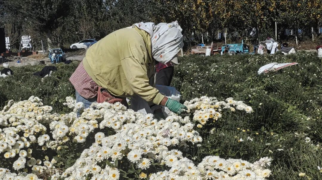 在种植户高全海的100亩药用菊花种植基地里,村民们早早来到田间,熟练地采摘着盛开的花朵。一朵朵菊花竞相绽放,淡雅的菊香弥漫在田野间。基地工作人员和前来采购的客商则忙着接收这些满载希望的花朵。