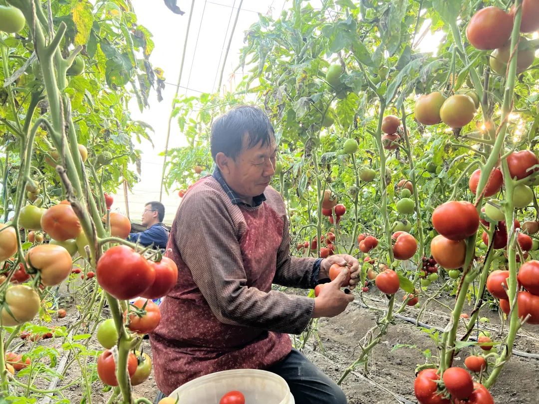 走进茫丁乡东庄村种植户李国玉的蔬菜大棚,阳光透过保温膜洒在地下,暖意融融。绿色藤蔓间,一串串色泽鲜亮的西红柿挂满枝头,西红柿的清香扑鼻而来。李国玉正忙碌地穿梭其中,熟练地采摘着成熟的西红柿,脸上洋溢着丰收的笑容。