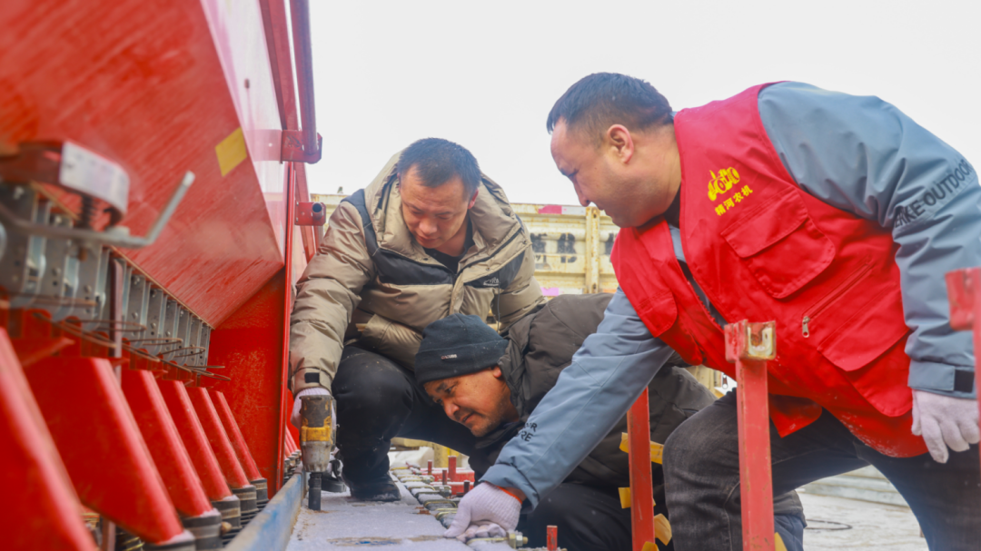 2月26日,在大河沿子镇别斯村,农机户王明亮家中停放着十多台农机具,他正和3名技术人员一同检修小麦、棉花播种机,主要检查播种穴播器、滴灌带等部件,预计检修工作需要半个月时间。镇农机部门技术人员现场讲解农机维修、服务保障及安全生产知识,提升农机手技能。“马上3月了 ,工作人员来帮我们检修农机,还给我宣传了旧农机置换政策,能省不少钱。” 王明亮说。