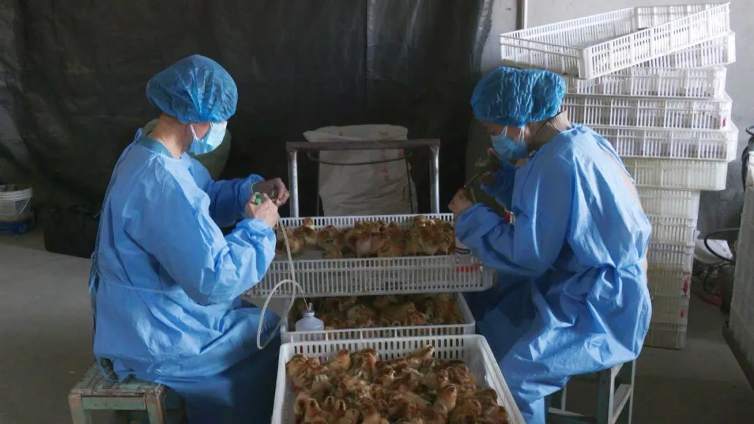 在出苗期间,厂房至少需要6名工人,这些工人都是周边的村民。其中一人专门负责鉴别鸡苗的公母,三到四人负责给鸡苗打疫苗。农七队职工庹新爱每天都会来给鸡苗打疫苗,这份工作相对轻松,每天能有200元的收入。