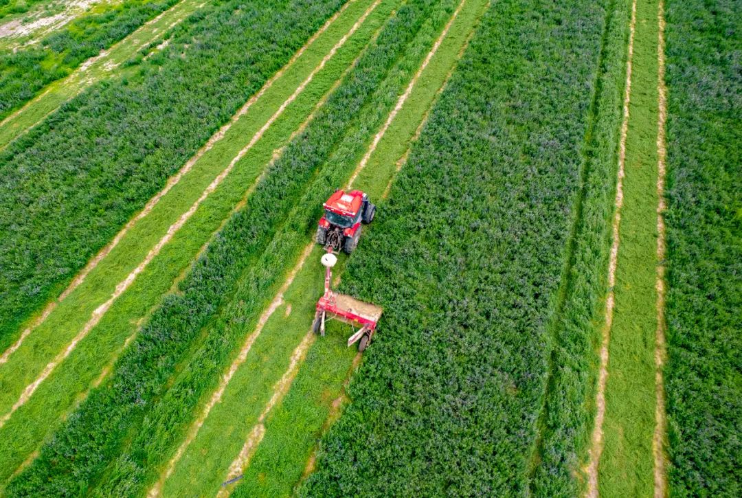 在大河沿子镇乌什布拉克村紫花苜蓿种植基地,收割机、搂草机、打捆机等大型机械来回穿梭作业,将成片翠绿的苜蓿收割、打捆,一辆辆满载苜蓿的拉运车辆在田埂间来回奔波。