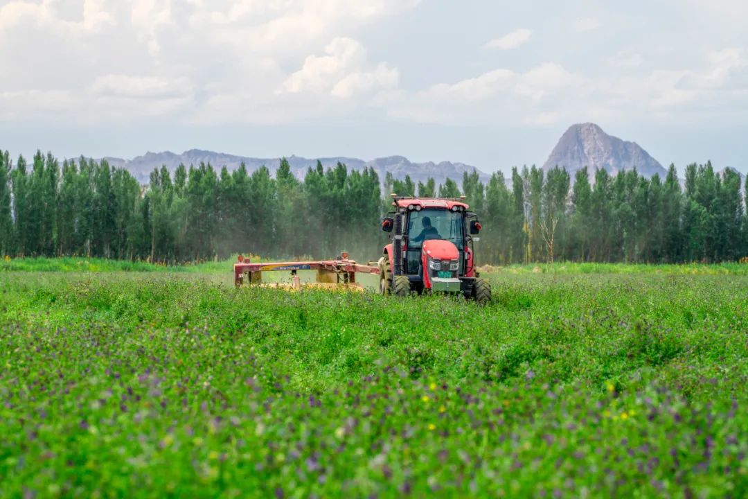 与此同时,在茫丁乡哈尔托热村,种植户阿玛斯别克・塔斯甫拉提家的苜蓿地里同样绿意盎然、清香四溢。小型收割机在田间穿梭,高效有序地完成收割工作。