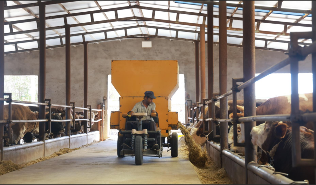 苏来满介绍道:“目前养殖基地占地30亩,以半自动化养殖模式为主,我们将养殖场地划分为圈棚、散养区、草料棚等各种功能区,自动化拌料机、粉碎机等设备齐全,工人只需按流程配料、喂食,养殖工作变得高效便捷。”