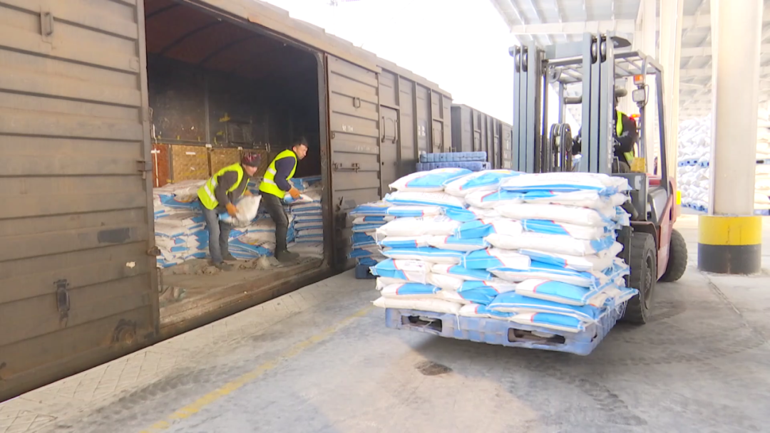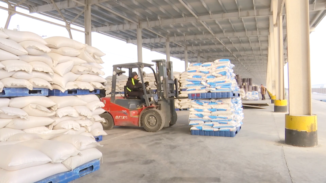 记者在精河国际公铁联运综合物流园看到,叉车正火力全开,有条不紊地将农业用硫酸钾卸到货场,这批农业用硫酸钾将通过货车运往全县各乡镇场合作社和农户家中。