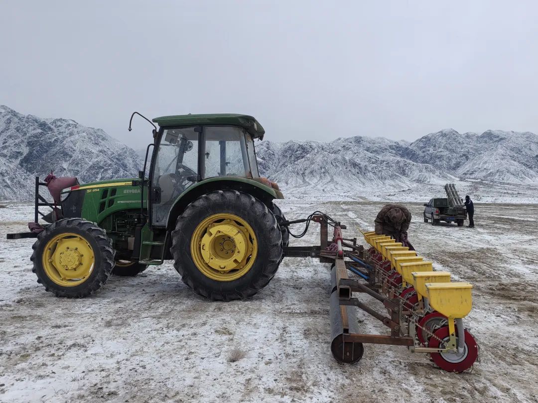 12月12日,在精河县托里镇江格尔其项目区,3辆大型播种机正在项目区松土作业,装载有各类草籽的播种机随后播撒草籽。与此同时,精河县气象局根据天气时机,在项目区开展人工增雪作业。