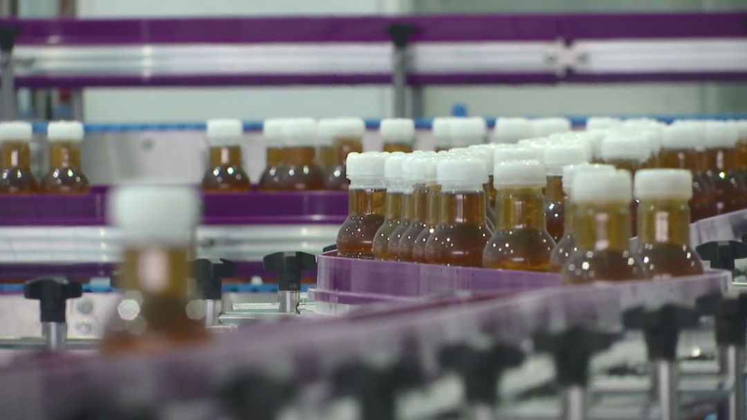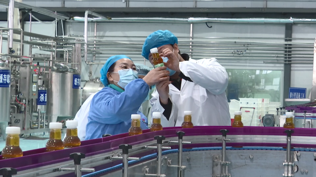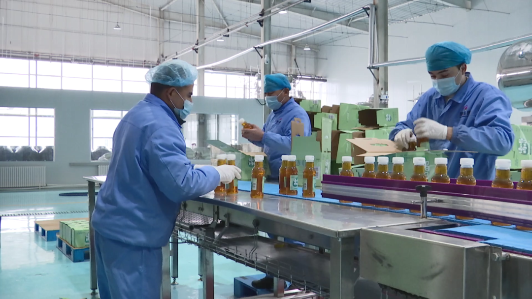 近日,在精河县天山果业农业科技有限公司生产车间里,一条条生产线正全力高速运转,罐装、消毒、吹干、贴标等流程井然有序,一瓶瓶新品枸杞凉茶饮料正从生产线上不断产出,工人们正忙着分拣、包装,现场一片繁忙景象。车间罐装技术工人库利班·阿巴尔汗说:“我们今天的目标是完成2000件枸杞凉茶的生产包装。”