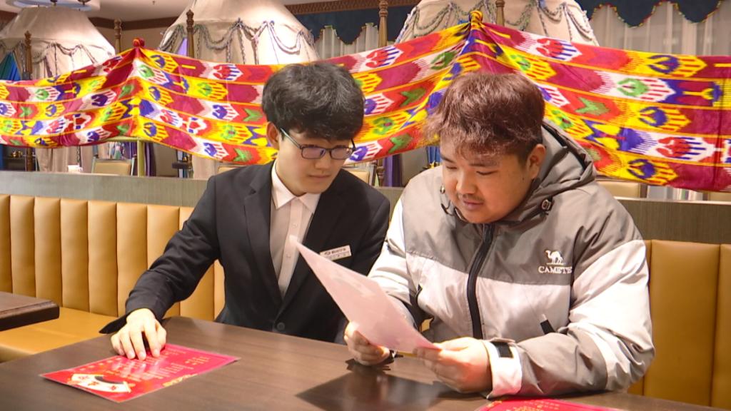 居民段陆洋在工作人员的介绍下,预订了年夜饭的菜品。他说:“今年家里的亲戚都回来了,人比较多,我们就选择在外面吃。这里的菜品很丰盛,环境也不错,相信过年在这里团聚也很不错。”