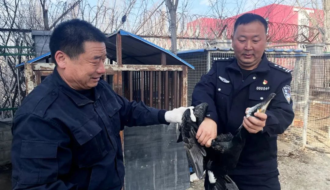 执勤民辅警得知情况后,对“长嘴鸟”进行仔细检查后送至食品药品环境犯罪侦查大队进行妥善救助。经食品药品环境犯罪侦查大队民警查看,这只“长嘴鸟”学名普通鸬鹚,系有重要生态、科学、社会价值的国家“三有”保护动物,判断是该鸬鹚脱离水域时间较长,长期未进食导致状态不佳。民警准备了小鱼进行喂食,并将鸬鹚放置在了水池中观察恢复状况。
