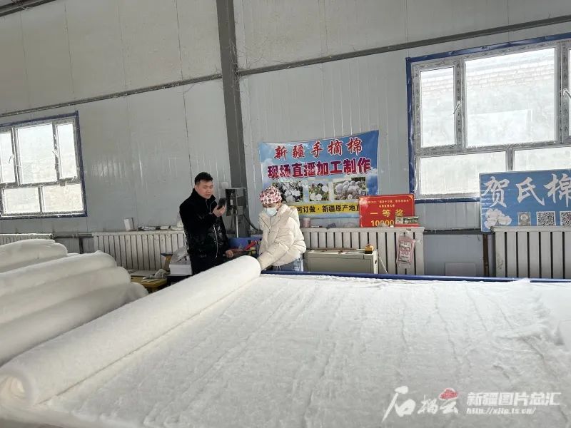 “您想在棉被上印个‘福’字吗?没问题!”“您想做成几公斤重,我们就做几公斤。”“我们加工的棉被原材料都是精河当地的棉花,加工出来的棉被柔韧性好、保暖厚实。”3月17日,在精河县八家户农场贺氏棉被加工厂,贺涛用手机给网友直播棉被加工过程。在他身后,一台台上料机、梳棉机、揉磨机轰轰作响,生产出的棉被由工人打包装货,发往全国各地。