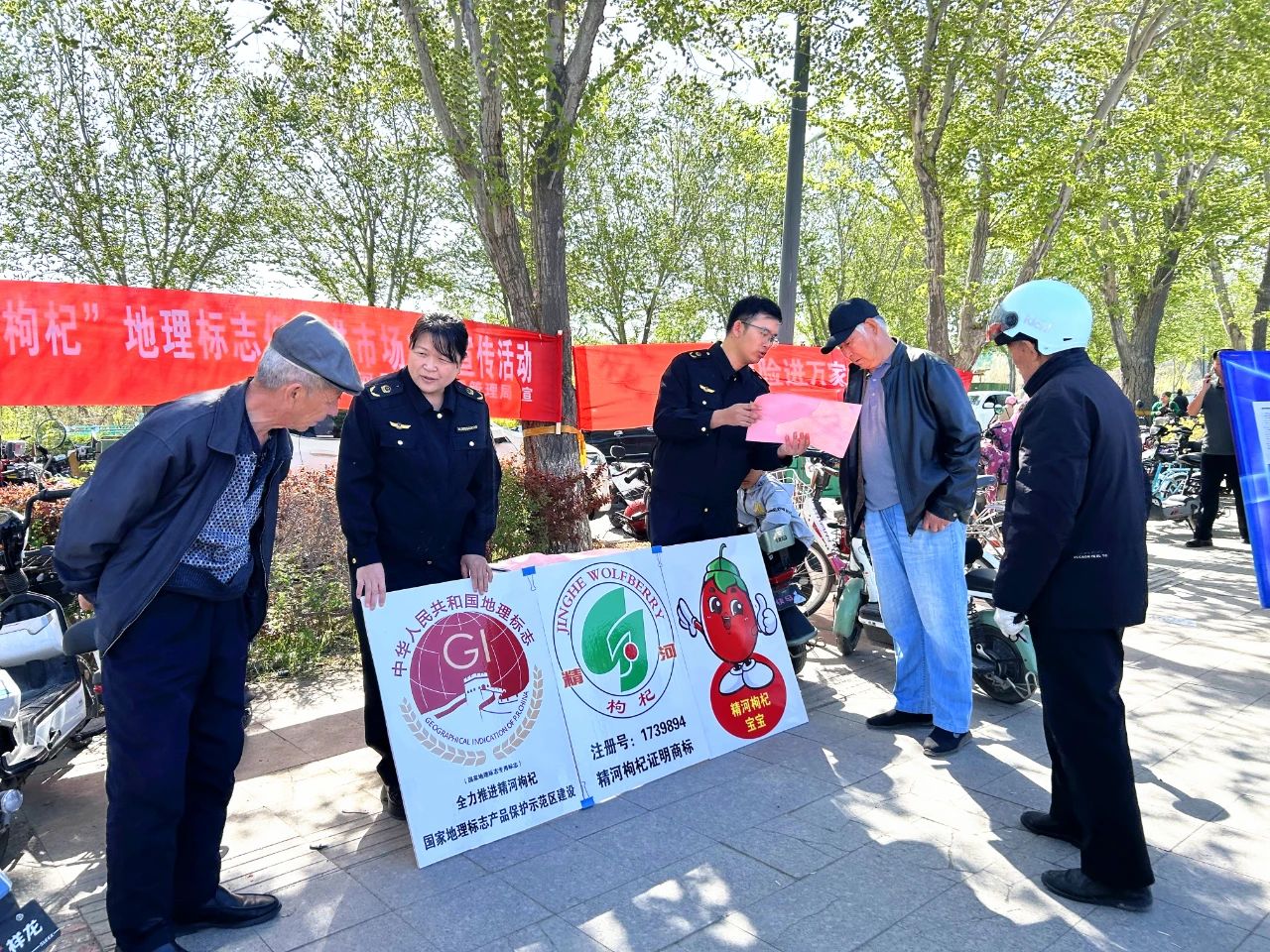 在精河镇和平小区宣传点,工作人员通过悬挂横幅、发放宣传单等形式,向沿街商户及过往群众宣传“精河枸杞”地理标志,动员和鼓励广大群众积极举报知识产权领域违法行为,营造了全社会参与知识产权学习的良好氛围。