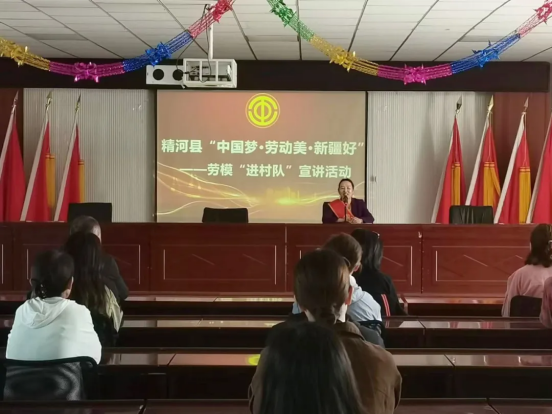 4月23日,精河县“中国梦·劳动美·新疆好”劳模“五进”宣讲活动走进大河沿子镇呼和哈夏中村、阿合其农三队,100余名职工群众聆听了宣讲。