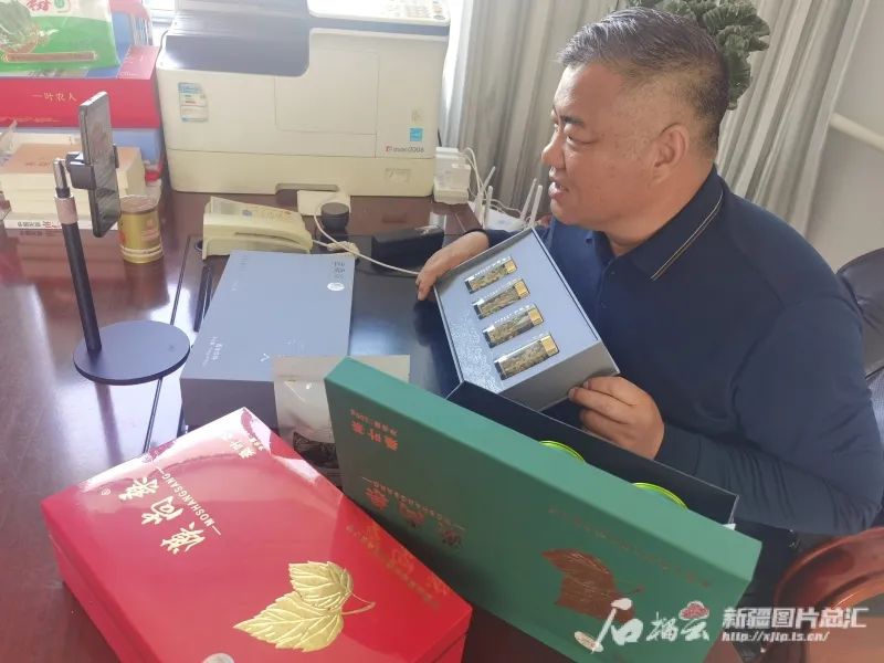 5月14日,刘吉发正在直播间里给粉丝介绍公司的桑产品。石榴云/新疆日报记者 白素君摄