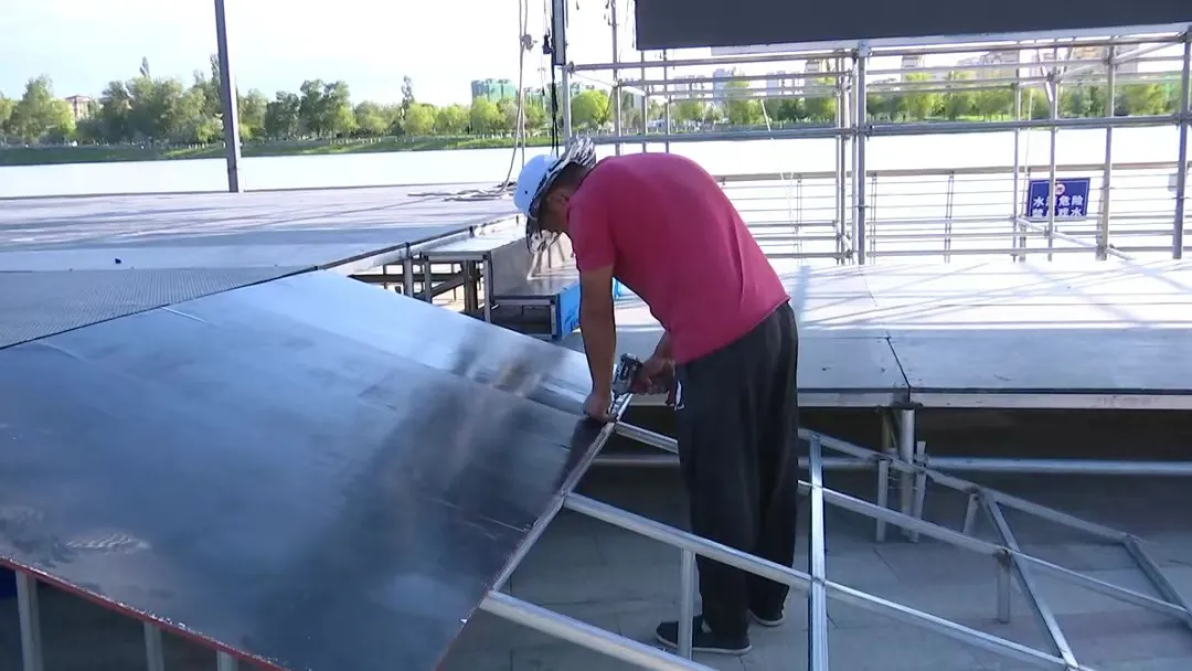 随着环湖赛的临近,开幕式舞台搭建工作也在如火如荼地进行,在滨河亲水河岸广场,开幕式舞台和灯光已搭建完成,工人们正忙着布线和清理舞台台面。据现场工作人员介绍,5月26日将进入彩排阶段。